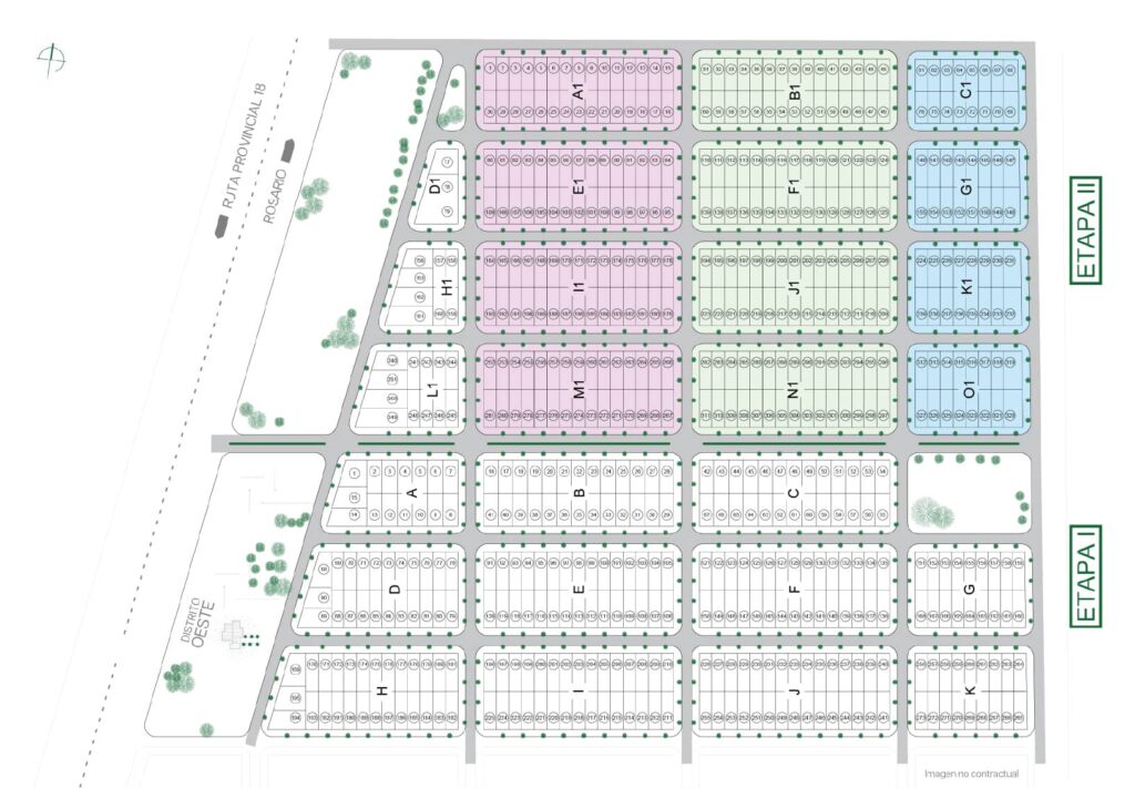 Campos del Oeste Alvear es Barrio Residencial Abierto compuesto por 600 lotes de 300 m2 cada uno aproximadamente, distribuidos en una diagramación urbana con una amplia forestación y espacios verdes